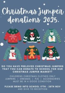 Do you have any preloved Christmas jumpers that you can donate to school for our Christmas jumper market. Please bring into school 17th-28th November.